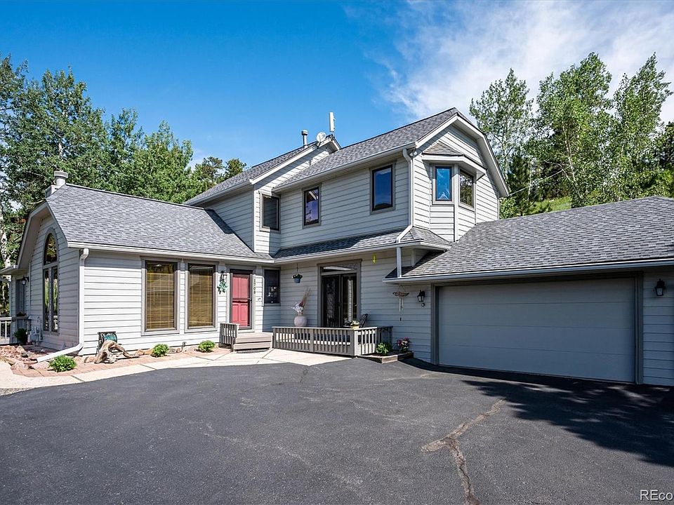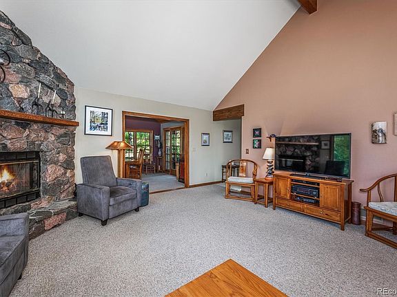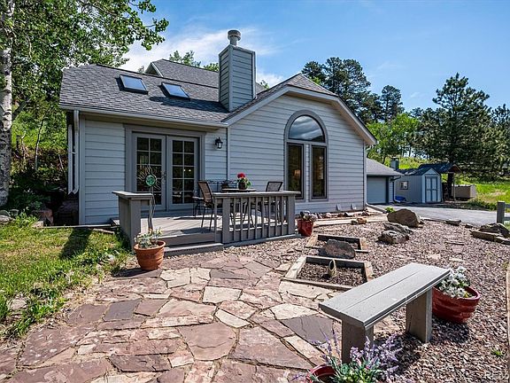 Dreaming of a serene lifestyle away from the hustle and bustle of the city? Tucked in the breathtaking mountainscapes of Evergreen, this home might be just what you're looking for! A paved access road and driveway lead to this 1.1-acre lot, perfectly placed to capture immaculate panoramas. High-quality Pella and Andersen windows pair with oversized sliding glass doors to usher in tons of sunlight and frame postcard views. Striking interior elements take inspiration from the surrounding landscape, from the stately stone fireplace in the living room to the impeccable wood details throughout. A vaulted tongue-and-groove wood ceiling with skylights is overhead in the impressive dining room, creating an ideal spot for hosting dinner celebrations with guests. Take your meals alfresco one of the Trex decks - the back deck for privacy & seclusion or the front ones, overlooking incredible vistas that provide a stunning backdrop. The eat-in kitchen has a travertine backsplash featuring hand-made tiles, hardwood floors, quartz countertops, ample storage, and a multi-seater island under elegant pendant lighting. Indulge in the well-sized proportions of the primary suite with a cozy window nook overseeing views of the valley. It's accommodated by a 3/4 ensuite and a walk-in closet, while a pass-through full bath connects the secondary bedrooms. Looking for a flex space that you can customize? There's a large studio you can transform into another entertaining spot, a hobby area, or a bike shop. Other must-see features of this gem include extra attic storage, a newer roof, an attached 2-car garage, high-speed Clear Creek Broadband internet, and Xcel natural gas. As an added perk, you'll have quick access to I-70. There's so much more to explore, so why wait? Come for a tour before the opportunity is gone for good!
