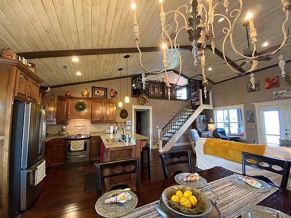 This piece of paradise awaits you! Beautiful 3bd/2ba waterfront home w/ upstairs loft. Master suite with french doors, jacuzzi tub and tile shower. Distressed wood on cathedral ceilings, Outdoor kitchen w/ new stainless grill, huge outdoor fireplace. Enjoy the lake view from your screened-in back porch, or open patio or relax on your own sandy beach area. Large 20X30 detached garage.