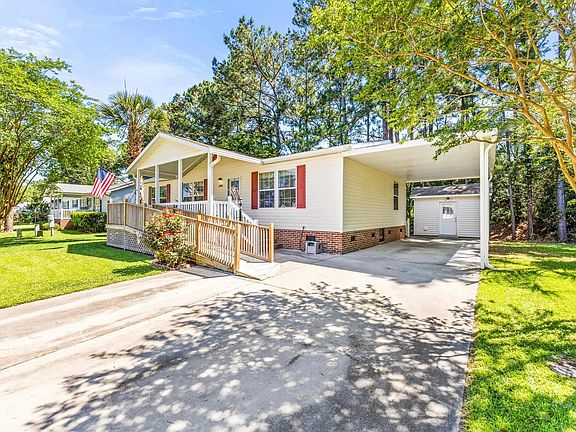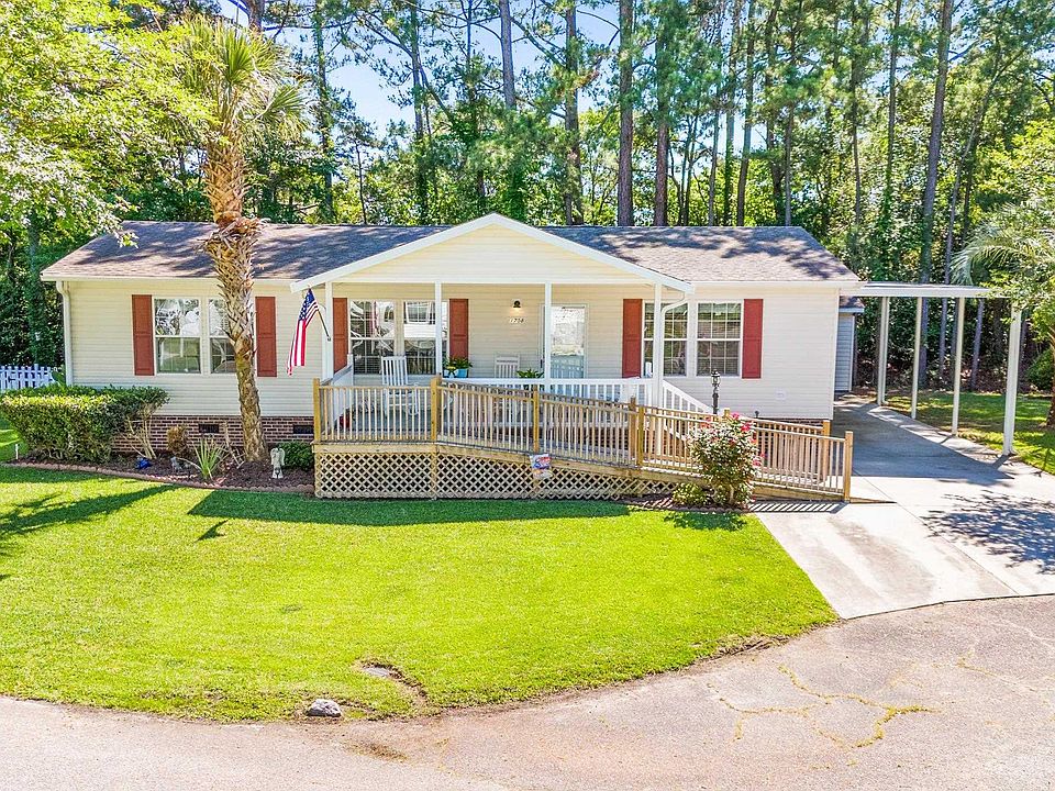 PRIME LOCATION! This beautifully cared-for,  3-bedroom, 2-bathroom home has had only one owner who has meticulously maintained the property. This home is tucked away on a cul-de-sac in Beachwood at the Heritage development, a gated 55+ community. This property offers a split floor plan with the open living space centrally located. An all season Carolina room was added off the back of the home and is equipped with a window/wall unit for year round temperature control. Recent updates include a new HVAC system (2023), an updated water heater, and a new handicap-accessible shower in the primary bedroom (2023). A handicap-accessible ramp has been added to the front of the property (easily removable if needed). The washer and dryer, both 4 years old, do convey. Outside is a convenient carport and work/utility shed. Beachwood at the Heritage offers an unbeatable location in Myrtle Beach. Located off of 17 Business, this home is a short golf cart ride to Market Commons and its many shops, restaurants, dog parks, and attractions it has to offer. Residents in this development will have access to the community pool, hot tub, rec room and more while also being granted full access to Lakewood Community and all their amenities and beach access.