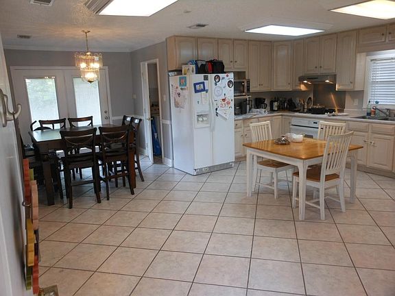 Very large open kitchen with lots of cabinets and counter tops. Spacious living room next to kitchen. Also dining ara off kitchen in front of attractive double glass doors to back yard. Master bedroom and and bedroom off hall. Third bedroom at front of home is ideal for office or older child. Over sized tub in master bath. Lots of closet space. Large laundry room with storage space. Very large storage bldg. (20x10) in back has electricity.
