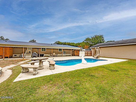 Upgraded LVP flooring throughout, complemented by neutral paint, creating a fresh and modern interior. A covered back porch that extends the entire length of the home. The centerpiece of this outdoor oasis is the heated saltwater pool complete with a slide, promising endless enjoyment. To ensure that the poolside excitement remains outdoors, a convenient changing room with a toilet has been thoughtfully added to the back patio. There's also an impressive fire pit for gatherings during cooler seasons. The wooden privacy fence encloses a secure and secluded area for your outdoor activities. On a generous .71-acre lot, there's plenty of room to roam and savor the great outdoors. The expansive driveway provides ample parking for you and your guests.