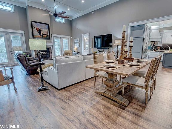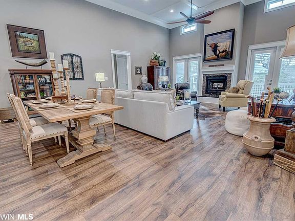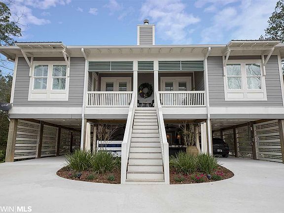 One of a kind Gold Fortified home on Fish River and NOT in a flood zone! All windows and exterior doors are impact resistant and require no exterior covers. Home was built on 10x10 pilings which are embedded 16' in the ground. This was a builders personal home and includes foam insulated exterior walls, floors and roof deck. Beautiful designer finishes in all bathrooms and kitchen. 10 and 15 foot soaring ceilings and 8ft. solid core doors. LED recessed lighting in all interior rooms beautiful split bedroom bedroom/open floor plan. Kitchen has beautiful granite counters, custom cabinets and stainless steel appliances. Downstairs is set up as a an outdoor den with TV and includes a full bath on that level. HOA includes boat slip (holds a 24-26'Boat) with lift, gated entrance, landscape lighting, sprinkler system and trailer storage area.