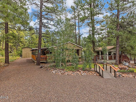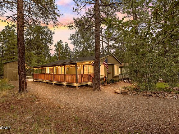 This cute, cozy, open floor plan cabin has 3 bedrooms and 2 full baths. The master ensuite is located on the opposite side of the home from the guests. Updated appliances, new white blinds throughout! Lot's of parking and beautiful curb appeal. Covered Porch the runs the length of the home! Newly installed durable luxury vinyl plank flooring thoughout. 2 large storage sheds, one with power. Between the sheds is a beautifully built patio with pavers, perfect for a fire pit/family get togethers. This is a turn key property in a golf community just south of Flagstaff. This gem is priced right!!!