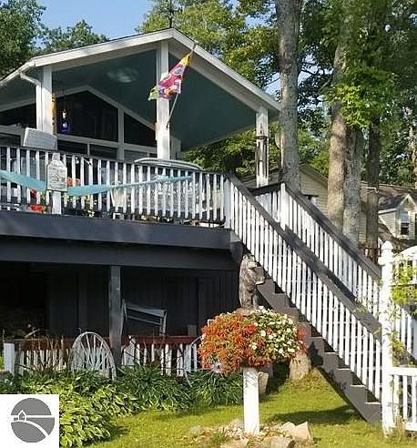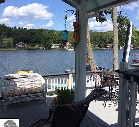 Lake George Lakefront home or cottage with 2 bedrooms and full bath, covered porch overlooking this sandy bottom all sports lake in Clare County. Offers many updates, on demand water heater, windows, doors, plumbing with pex, newer appliances and has a washer and dryer all in one, dishwasher....many perennials, shed, storage under deck, seawall and dock.