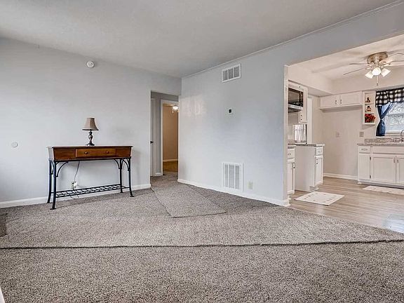 So many updates in this 2-bedroom home tucked away on Evansville's East Side including carpeting, vinyl, and fresh paint. This light-filled open floor plan offers a great space to entertain in the living room with new carpeting, with the eat-in kitchen featuring updated countertops, cabinetry, and flooring. The two spacious bedrooms have new carpeting, and the bath offers an updated vanity and flooring. There is also a large built-in linen closet just off the bath. Outside is a great space to entertain, with a large concrete patio in the back yard, and fresh mulch along the front of the home offering charming curb appeal. Per Seller: updates in 2018 include new windows, new roof, new furnace, new air conditioner, and new water heater. This home is a must-see! Sale includes: above-range microwave.