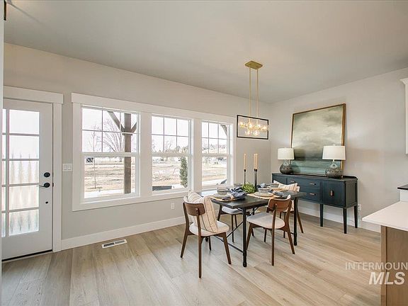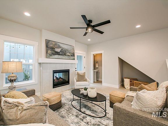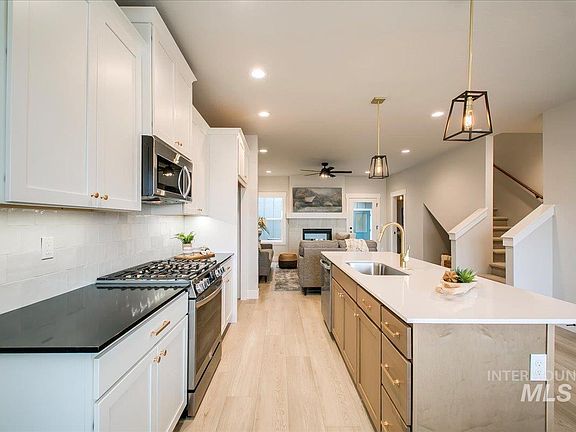 Exceptional, low-maintenance custom townhome lives large in the heart of Eagle. Beyond the covered front porch awaits a thoughtful floorplan featuring an open kitchen/dining/living layout seamlessly incorporating a spectacular interior courtyard. You’ll love the indoor/outdoor fireplace & glowing string lights to bring warmth and ambiance! Gorgeous kitchen w/ huge island, quartz counters, 42” upper cabinets w/ under cabinet lighting, full backsplash, black matte & gold lighting/hardware, stainless steel LG appliances, walk-in pantry & luxury vinyl plank flooring throughout main level. Upper bonus room overlooks courtyard and is filled with natural light. Split-bedroom design w/ ultra-private master suite wing overlooking common area w/ mountain views. Alley-load, detached garage. Prime location for quick stroll to downtown restaurants, Boise Greenbelt, Guerber Park, Eagle Hills Golf Course, or hop on 55 for quick escape to the mountains!