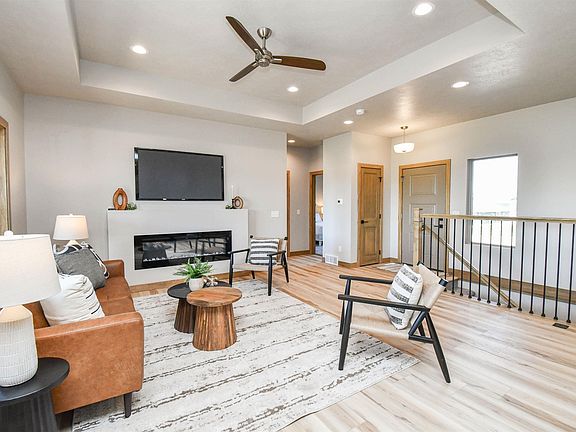 Welcome to this stunning ranch-style home offering 1,551 square feet on the main level, thoughtfully designed for modern living. Step inside to discover an open-concept layout featuring a spacious living room with a striking tray ceiling and an electric fireplace for added warmth and ambiance. The kitchen is a dream with a massive 9-foot island, sleek quartz countertops, stainless steel appliances, and a walk-in pantry with convenient rollout drawers. Enjoy easy-care luxury vinyl plank flooring through the main floor living areas. The spacious dining area opens to a covered backyard deck—perfect for entertaining or relaxing outdoors. The main level hosts three bedrooms, including a beautiful primary suite with a walk-in closet and a spa-like bathroom featuring in-floor heat, dual vanities, a tile shower, and a glass shower door. The finished and painted garage comes fully equipped with finished and painted walls/ceiling, a heater, hot and cold water, floor drains, and garage doors with windows. Garden-level windows in the lower level bring in great natural light, offering a perfect opportunity to finish the space and build instant equity. Sod, rock, edging, and sprinkler system are all included in the price—ready for you to move and enjoy!