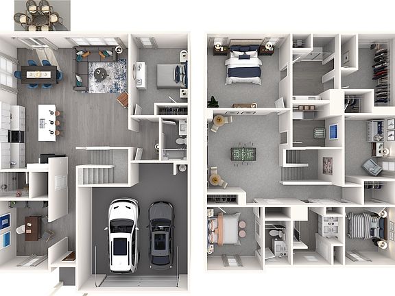 The Johnson's foyer gives way to the open-concept living area. Two flex spaces, allow you to customize the layout. White cabinets with jasmine white quartz countertops, weathered hard surface flooring with beige tweed carpet in our Lush package.