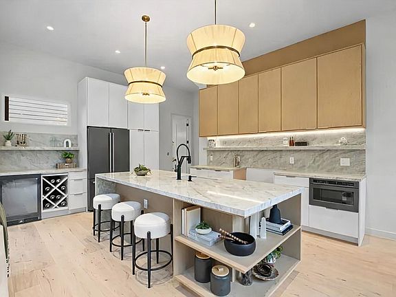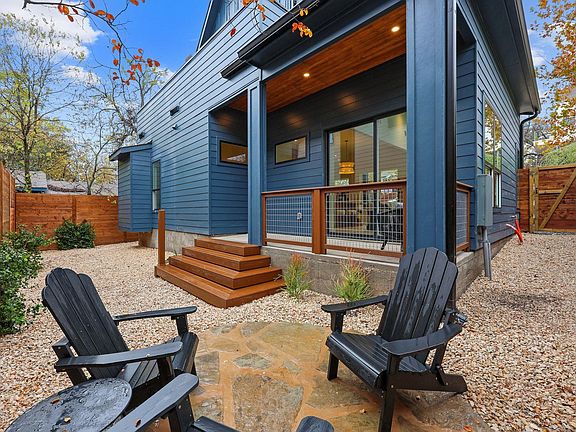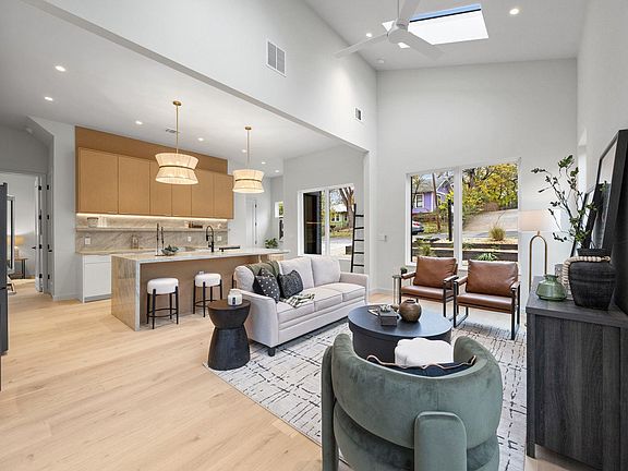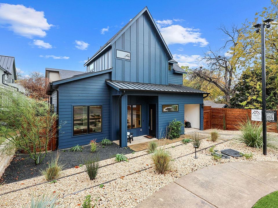 Experience elegant modern living in this stunning new build by J Davis Construction, ideally situated in vibrant East Austin. From the moment you arrive, the home makes a striking impression with beautifully designed xeriscaping that enhances curb appeal while keeping upkeep effortless. Thoughtfully crafted with a perfect balance of style and comfort, the open floor plan features soaring ceilings and expansive windows that flood the space with natural light, accentuating the rich wood floors throughout. The living room, highlighted by a skylight, flows seamlessly into the show-stopping kitchen—an entertainer’s dream with luxurious Taj Mahal quartzite countertops, an oversized island with bar seating, a dedicated mini bar plumbed for an ice maker, abundant cabinetry with warm under-cabinet lighting and pull-out drawers, and a premium GE Cafe appliance package. A bedroom, conveniently located near a chic full bath, completes the main level. A thoughtfully designed staircase leading to the second level features motion-sensored handrail lighting, offering enhanced safety, subtle nighttime illumination, and a sleek architectural detail. The primary suite is a true retreat, offering direct access to a turfed balcony—perfect for morning coffee, evening wind-downs, or a quiet moment enjoying the views. The primary suite also includes a walk-in closet with custom built-ins and an ensuite with dual vanities and a frameless glass shower. An additional upstairs bedroom with its own ensuite bath provides ideal flexibility for guests, a home office, or creative space. Outdoors, the fully fenced backyard invites relaxation and entertaining with a covered patio, an additional covered area for lounging or grilling, and drought-resistant landscaping that’s both beautiful & practical. All of this is set in a prime location just steps from the elementary school & minutes from downtown, the airport, and East Austin’s beloved dining, shopping, & culture. (CONDO REGIME W/ NO MONTHLY FEES)