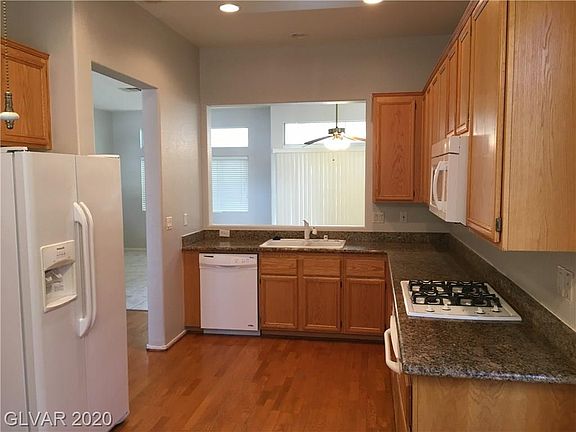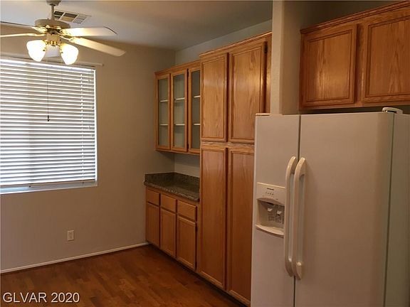 Beautiful Summerlin single story town home. Upgrades include glass front kitchen cabinet, stunning glass front doors, fireplace, solar screens, and much more! Whirlpool and GE appliances included! Master has sliding doors to back patio. Interior in the process of being painted.
