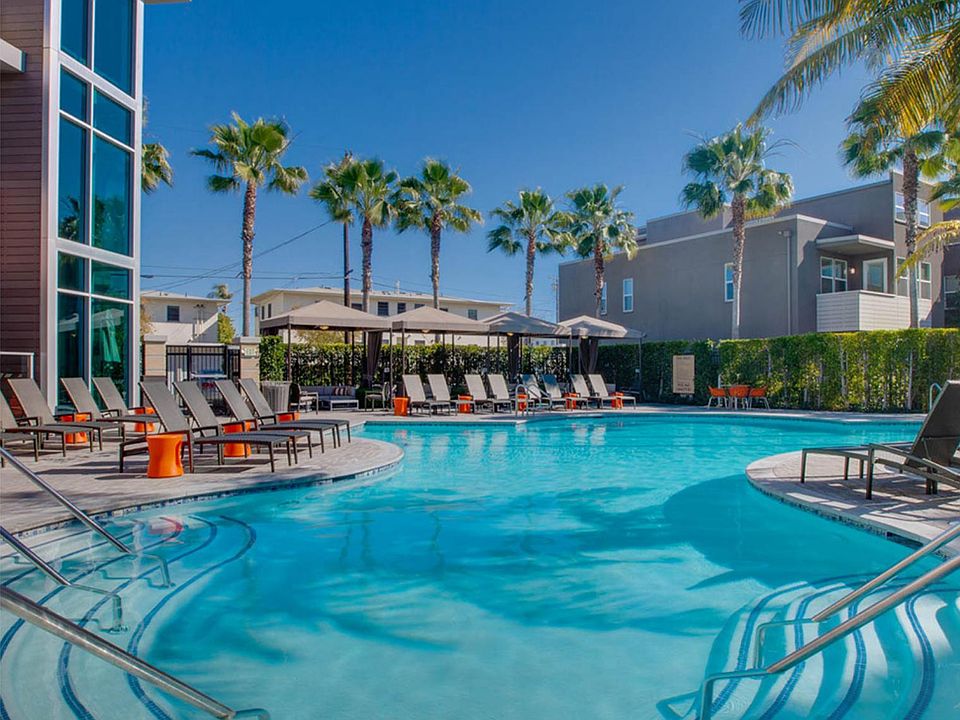 1709 Penmar Ave, Apt 3, at Lincoln Place Apartment Homes Top floor, corner, spacious apartment with lots of windows and natural light. The apartment boasts a huge kitchen with stainless steal appliances (fridge, oven, microwave, dishwasher) as well as a washer and dryer. The Master en-suite bathroom has a really spacious shower with glass walls/door and beautiful tiling. Both bedrooms have built in closets as well as a linen closet in the main room. In addition to hardwood floors, the windows already have chic wooden blinds installed and the home has been newly renovated with a smart home system that includes mobile phone control and pin-code access with both permanent and temporary codes available. Penmar Ave in particular has plenty of street parking. Garages (with storage lockers) are also available behind the unit should you require that. This apartment is also in walking distance of the Penmar golf course, the Penmar recreation centre (includes tennis and basketball courts and a baseball field) and an adorable neighbourhood mart 1 block down but still on Penmar Ave. For driving, the apartment is close to Venice Blvd and Palms Ave (which becomes National) but it never loses its charming neighbourhood appeal. Onto the amenities, which is really the selling point: The community has a massive two-storey gym, a slightly heated, salt water pool that is great for year-round use and a roof top terrace with wifi. Barbecues and picnic seating are scattered throughout the property and in addition to lots of palm trees and grassy areas, there is also a dedicated dog-walking park. There is on-site management and 24hr security and the community is walking distance from Ralphs/Rite-aid, Whole Foods/CVS, fantastic cafes/restaurants as well as the Famous Abbot Kinney and the Venice boardwalk.