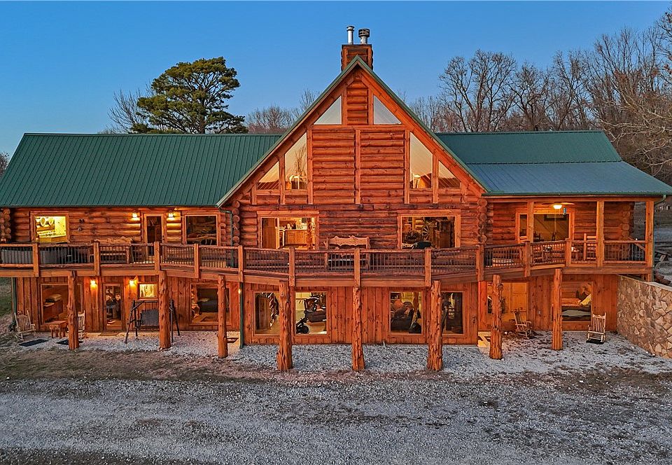 Welcome to Grey Wolf Ranch of the Ozarks—an exceptional handcrafted white pine log home blending rustic elegance with fine craftsmanship. Featuring oak hardwood floors, hickory cabinetry, granite and stone countertops, an elm kitchen island, and custom wood dining table, the home showcases natural materials throughout. Cedar-lined closets, custom doors, spalted beech accent walls, copper sinks, and rustic travertine tile elevate the 3.5 baths, including a spa-like master with stand-alone tub. Wood-cased windows, cedar posts, and rebar railing add character, while a wraparound deck with hot tub invites relaxation. Offered fully furnished. A 120’x40’ barn includes four horse stalls, heated workshop with bath, water, and large loft. Set on 63± acres with rolling hills, views, creek, ponds, arenas, and five fenced pastures with water. Ideal for a family home, equestrian use, retreat, rental, or venue.