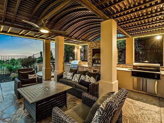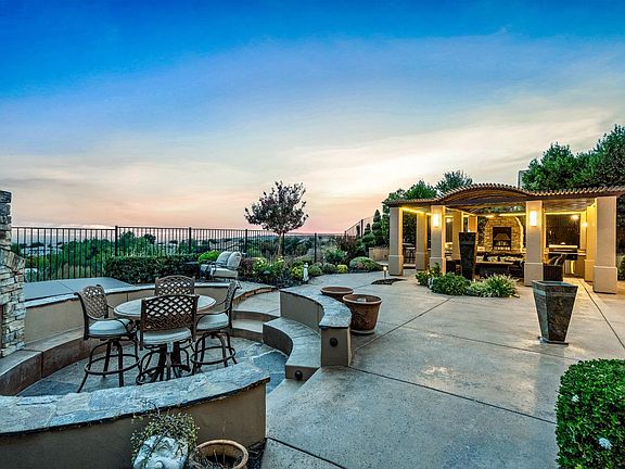 Located in the prestigious gated community of Serrano, this stunning 5 bedroom 3.5 bath residence offers over 3700 sq. feet of luxury living space backs to greenbelt and has incredible views of the Sacramento Valley. Enter through the front courtyard with fountain into a spectacular 2 story living room and dining room with butler's pantry and wine cellar. The open kitchen features high end cabinetry, granite slab counters and stainless appliances. This comfortable space provides many entertaining options and overlooks an expansive family room with hardwood flooring and fireplace. Relax in your main level primary suite featuring luxurious bath with separate vanities, soaking tub, walk-in shower, and built-in closet system. The functional floor plan of this home includes 3 additional bedroom suites upstairs with loft media room/library. In the center of it all is a spacious rec room or 5th bedroom with special views. Designed for entertaining, the backyard offers an outdoor kitchen with granite counters, natural stone fireplace with circular seating, fountain, wood/gas pizza oven, Traeger smoker, and built-in BBQ perfect for enjoying breathtaking sunsets. Owned Solar. 3 car garage with built-ins & epoxy floors.Prestigious El Dorado Hills schools including OAK Ridge HS.