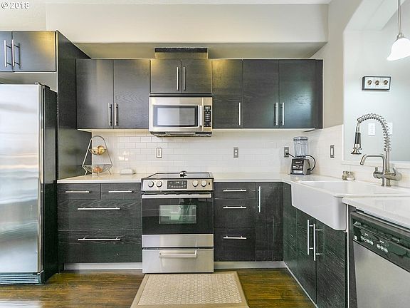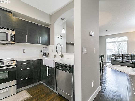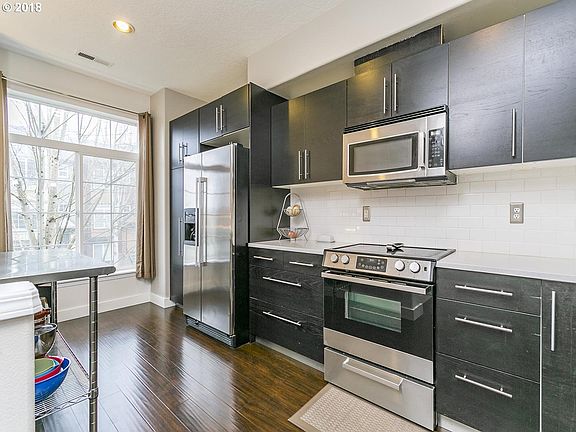Beautiful move in ready townhome near Nike and transit. Remodeled kitchen with farm house sink, quartz counters, pantry, and eating bar. Open concept living and dining with outdoor balcony. 2 bedrooms upstairs, with perfect den or third bedroom on the lower level with half bath. Strong HOA with rec facilities, pool, and hot tub.