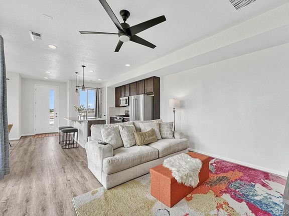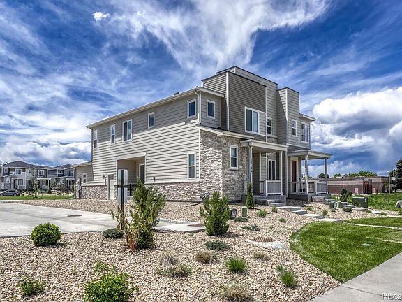 Beautiful modern townhome located in Parkway Point! This open and modern floor plan features a large family room with surround sound pre wire and access to the covered outdoor patio. The kitchen has quartz countertops, large kitchen island, stainless appliances with gas range, and plenty of space ideal for entertaining. The formal dining room is conveniently located just off the kitchen. The main level also boasts a large closet for storage, access to the attached 2 car garage and a main level powder bath. Upstairs you will find a large primary suite with a walk in closet and a beautiful ensuite bathroom with designer shower tile. Take in the mountain views from this corner unit and make this townhome your new home. This is a must see turn key ready townhome! In close proximity to Buckley AF Base, DIA, and personal services and shopping this townhome will not disappoint.