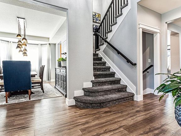 Step into contemporary luxury living in Cottrell Farms, this is 17098 Knollside Avenue, perfectly blending curated finishes, endless upgrades, and timeless, classic design. All new laminate hardwood floors greet you upon entry and unfold to an open floorplan boasting new interior paint, all new interior doors with matte black hardware, 6’ baseboards, and upgraded lighting throughout. Enjoy hosting dinner parties or intimate family meals in the formal dining room. The stacked stone quartz fireplace is the focal point in the spacious great room which connects seamlessly to the gourmet kitchen. The upstairs primary suite is a true retreat, complete with in-suite laundry, a beverage bar, dual closets with custom closet systems, and a fully remodeled 5-piece bath with a free-standing tub and walk-in glass shower. The finished lower level offers additional entertaining space including a home theater with tiered seating and a wet bar. A bonus family room with an electric fireplace is the ideal spot for cool Colorado evenings and the bonus flex room could be used as a home gym or playroom. The private 5th bedroom and bathroom is great for guests or a mother-in-law suite. Additional features of this stunning home include all-new Andersen windows, a main floor home office, 2 laundry rooms, brand new exterior paint, a home water softener, fully-paid off solar panels, brand new carpet, a huge outdoor patio with a pergola, smart home technology, and a tandem 3-car garage. This home has been heavily updated and pride of ownership exudes. Ideally located within minutes of neighborhood parks, nearby Douglas County schools, shopping and dining in Downtown Parker, and easy access to major roadways. Come see why 17098 Knollside Avenue is luxury at its best in Parker, CO!
