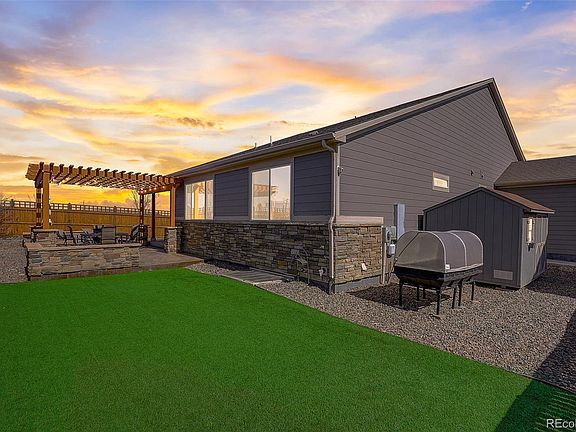 Outside, enjoy the >1000sqft professionally stamped concrete patio with 16x16 stone/cedar pergola, built-in natural gas fire pit with glass frame and stone sitting wall, massive sunning deck, and pet-friendly (irrigated) artificial turf, French drains, and sustainable xeriscape. Additionally, the OVERSIZED 3-car garage (with 20' ceilings) and 8x12 storage shed offer the most discerning hobbyist additional storage for tools and toys.