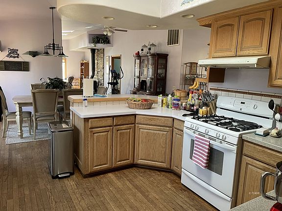 This beautiful 2500 sq ft home sets on 1 full acre consisting of 2 parcels. Views of the mountains and amazing sunsets. Kitchen, Dining and Den is open floor plan for entertainment. Vaulted ceilings with sky lights and large double pane windows throughout the home to take in the light and views. Very large master bedroom and master bath with garden tub, shower stall and vanity. 3 bedrooms, 2 baths and 2 rooms used for offices or could be used for additional sleeping. There is a total of 11 rooms. Home has hardwood flooring, tile flooring and carpeting. The home has 2 sources of heat. Central heating and air and woodstove to cozy up to in those winter months. Rap around covered deck for outdoor summer entertainment and BBQ's or just your own peaceful setting. New comp roof. Vacant lot has a fenced in area for animals and a small barn for cover and feed. Close to town and schools. City power, water and sewer. Call for a showing today.
