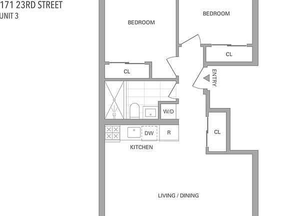 Welcome to Apartment #3 at 171 23rd Street! This 2 bedroom/1 bathroom apartment enjoys northeastern and southwestern exposures, a renovated kitchen and an open-concept living/dining area. Entering the apartment through the hallway, you are greeted by a modern kitchen with white cabinetry and full-sized stainless steel appliances, including a dishwasher and microwave. The living/dining space has three windows facing southwest and multiple layout options, ready to decorate as you see fit. The bathroom is completely updated featuring under-sink storage and a glass door shower. The in-unit washer/dryer is located directly off of the bathroom. Two bedrooms are situated at the back of the apartment, both with ample natural light and closet space. Please note that some photos have been virtually staged. Please inquire about pricing structure.