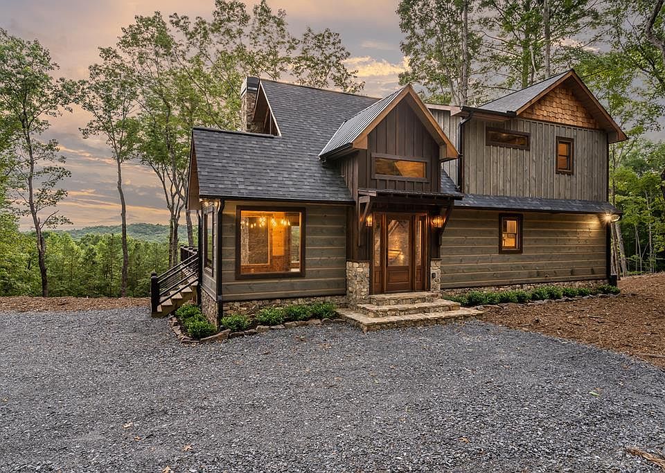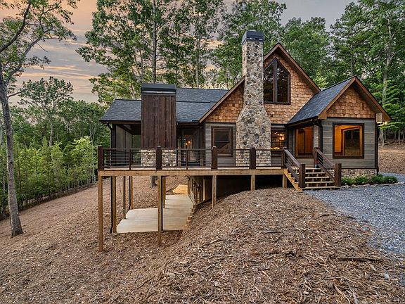 Welcome to the Best of North Georgia Mountain Living! You'll fall in love with this gorgeous home from the moment you arrive. Take in the layered long range mountain views, tree canopy, perhaps a family of deer quietly strolling by, and the fresh mountain air! The builder thoughtfully combined a variety of textures, appointments, and features offering the coziness of a cabin, while including modern luxury touches throughout. The exterior blend of wood, stone, and metal compliments the backdrop and serves as a welcome mat for you and your visitors. Notice the easy entry to the main level, the open flow of the floorplan, quality materials throughout, expansive windows frame the outdoor beauty, stone fireplace, modern cabinets, granite counters, generously sized bedroom and full bath, laundry closet, and separate dining area. Includes a screened porch with outdoor fireplace for chilly mountain evenings watching your favorite game or having a quiet cup of coffee in the morning. The upper level is a sanctuary with double vanity (granite), shower, walk in closet, and a private screened porch to enjoy sunsets and sunrises! The terrace level includes a wet bar, stone gas fireplace, bedroom, full bath, and plenty of functional space for a bunk room, games, office, family room, etc. so let your imagination soar! Don't miss the concrete porch spanning the length of the home. This home's location is convenient to Blue Ridge, Blairsville, and all north Georgia attractions: area shopping, dining, festivals, tubing, hiking, wineries, and events! Ideal for full time living, vacation home, or short-term rental investment!