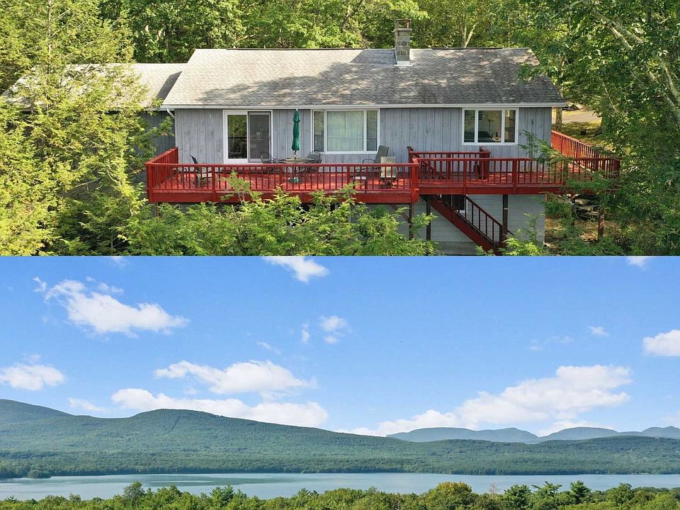RARE RESERVOIR AND MOUNTAIN VIEWS YEAR-ROUND FROM MID-CENTURY MODERN GEM: NATURE AND DESIGN WEAVE TOGETHER This well-maintained mid-century modern ranch-style home, set on over 8 private acres, is perched high above the Ashokan Reservoir in West Hurley, providing stunning views of the reservoir and surrounding mountains all year long. The property is in a secluded spot with very few homes on a dead-end, private lane. The view looking north is one of the most perfect in the Woodstock-Kingston area, visible from large windows and sliding glass doors in the well-proportioned, light-filled living room (with working stone fireplace), dining room and master bedroom with en suite bath. Spring, summer and autumn dine and relax enjoying nature's masterworks on the large, north-facing deck. In winter the views open up even more, and the 8-acre parcel descends towards the reservoir, so the owner controls all the trees in between them and the mountain and water tableau; an even more jaw-dropping view is waiting just behind a minimal amount of tree work. Down the hill amidst dramatic rock outcroppings is a private tennis court situated on a plateau above the view-shed. The house has an updated kitchen, a full bath for the extra bedrooms and guests, and a half-bath in the basement, servicing the basement den (which also sports its own stone fireplace) nestled next to gorgeous, interior stone outcroppings that serve as footings for the front of the house. The house has a 2-car attached garage, a recently installed Buderas boiler and a high-tech air exchange system, which keeps the basement and den bone-dry. The owners re-flashed and re-roofed recently; all the major maintenance has been done to keep the house in pristine shape. All that remains is for you to come and shape this gem entirely into your own modern masterpiece!