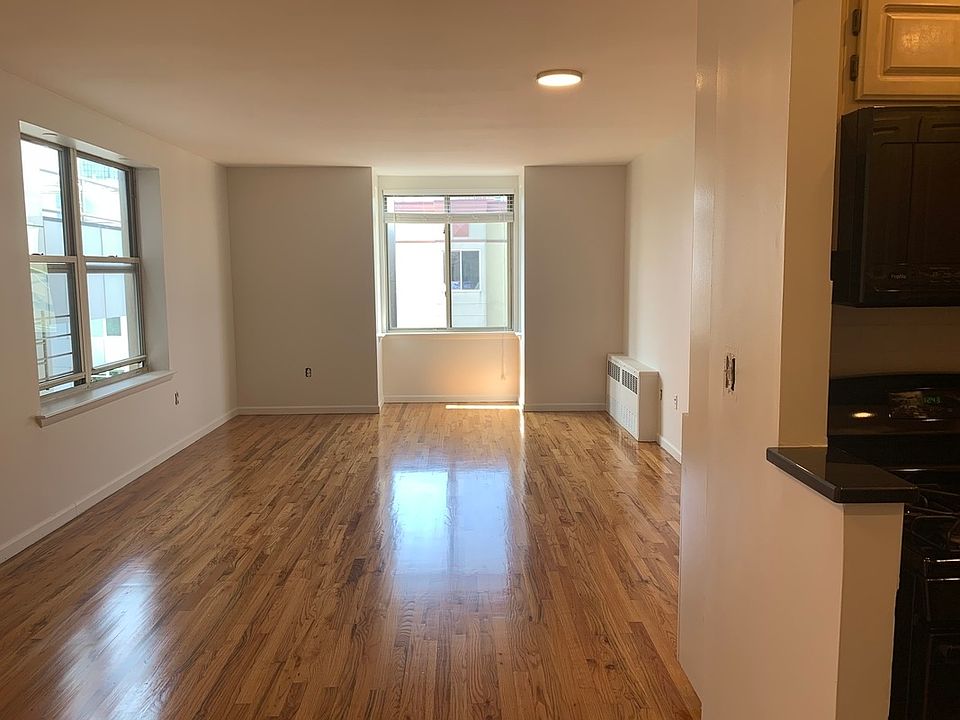 Spacious top floor 1BD with alcove, perfect for a home office or baby den. Kitchen has stone countertops and black GE appliances (including a dishwasher and microwave). Unit has hardwood floors, tons of closet space (with two closets in the bedroom and a WALK-IN closet in living room), and beautiful natural light. Heat, hot water, and gas included. Building is a doorman/elevator building with large communal courtyard and laundry room. Pets allowed. Live in Super. FIOS & Spectrum available. NO FEE. Available 10/01. Viewings by appointment only. Masks required.