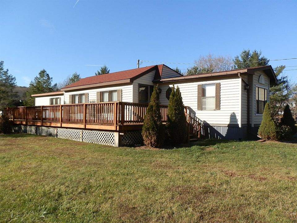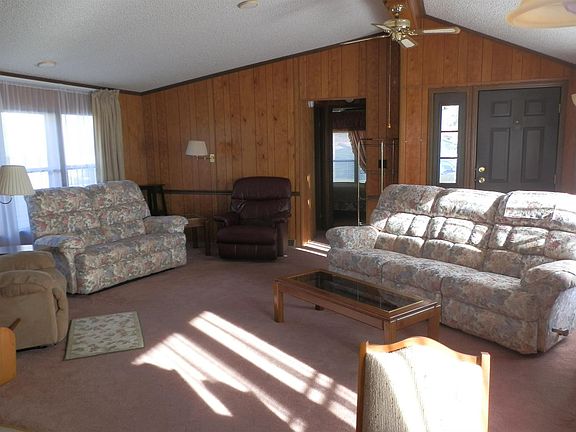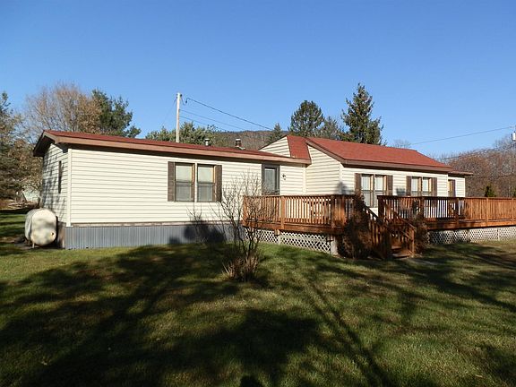 Afordable single wide mobile home with extended living room located on 14 level acres. Features vaulted ceilings, central A/C. Large decks and separate garage/workshop. Walk to village services.