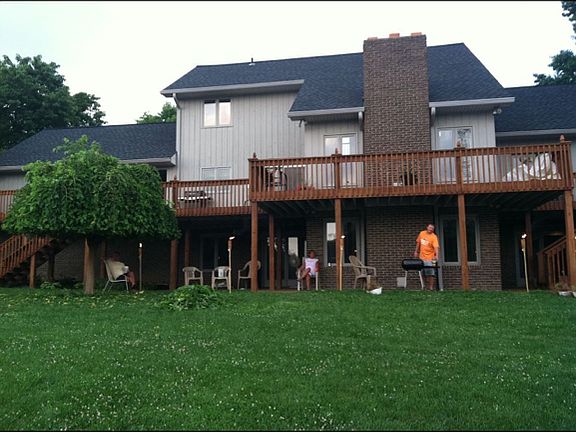 Beautiful home setting is situated overlooking 8 acre lake! Striking 4 bedroom 3 bath home with over 4300 sq/ft finished including awesome WALKOUT BASEMENT. Impressive 2 story great room features brick front wood burning fireplace. Kitchen offers plenty of quality cabinets, tile floor, solid surface countertops and patio doors to a wonderful deck. Main floor master suite very private includes a gorgeous walk in tile shower, double vanity, walk in closet, large bedroom and crown molding. You'll love the catwalk view from upstairs overlooking the great room & entry. Upstairs with 3 additional bedrooms and full bath. Plenty of room to entertain with huge basement family room, wet bar with built in refrigerator, 2nd fireplace and tons of storage! Basement walks out to a beautiful large patio and 8 acre neighborhood lake. Attached 2.5 car garage and large deck with 2 staircases. Per Seller 2012 Exterior Heat Pump, Roof, gutters, many fixtures, extended basement patio, 2" blinds. Convenientl
