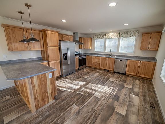 NEW for you and WELL INSULATED too is what you will find at this 3 bedroom, 2 bath home in the pleasant 55+ Edgewater Homes community in Rhinelander! The homes interior features the living room with attractive wood accent wall, a spacious kitchen with stainless appliances & peninsula seating, main floor laundry hookups, two bedrooms, a full bath, and the primary suite with walk-in closet & private full bath. The exterior enjoys low-maintenance vinyl siding, gutters, quality skirting, a blacktop drive, two entrances with decks, and a 16x32 detached garage. Located on Thunder Lake of the Rhinelander Chain, the Edgewater Homes community offers access to year-round boating and dining, as well as golfing and socializing at the private golf course just down the road. Docks are available for seasonal rental to homeowners per the Edgewater Community's rules and regulations (ask agent for lease terms). Homes in Edgewater don't last long...especially the brand new ones!
