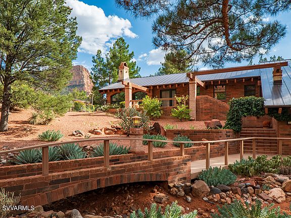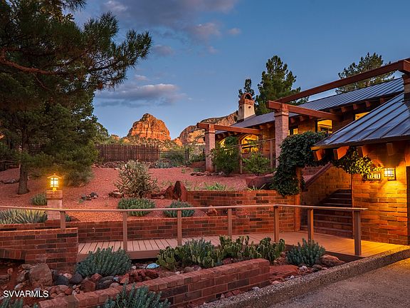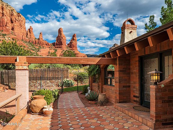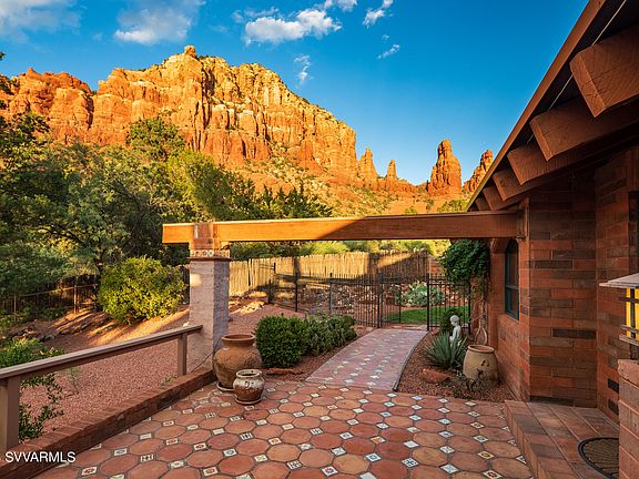 Imagine being surrounded by a breathtaking natural amphitheater of towering red rock, while living in an enchanting one-of-a-kind brick home built with love and imbued with old-world character. Fully modern in functionality, this fairytale estate features cathedral ceilings, classical arches, and a unique artisanal gas fireplace. From the front patio you have a close-up view of the Chapel of the Holy Cross, Twin Buttes, and the majestic spires called the Two Nuns. Once inside, you can eat your breakfast with a direct view of this magical pair through a 10'-high picture window. French doors in the living area open up to a lovely back patio and green grass with magnificent red-rock views and the full canopy of stars at night. Enjoy superb hiking trails just a brief walk from the property, then unwind in the therapeutic spa installed in 2022. The handsome kitchen features a farmhouse sink, recent high-quality appliances, and ample counterspace. Your elegant primary bedroom offers an unobstructed view of Cathedral Rock, high ceilings, walk-in closet, private bath with backlit mirrors, and French doors opening to a rose garden. There are two additional spacious bedrooms, also with tall ceilings. The hall bathroom has been updated with deep-soaking tub, glass enclosure, recessed lighting, and backlit mirror. You'll be living on a quiet cul-de-sac in the Chapel neighborhood, close to nature, while still convenient to shopping and restaurants. This is a rare opportunity to own an utterly captivating home in the heart of Sedona's wondrous energy and beauty! No HOA, STR's allowed, Buyer to verify.