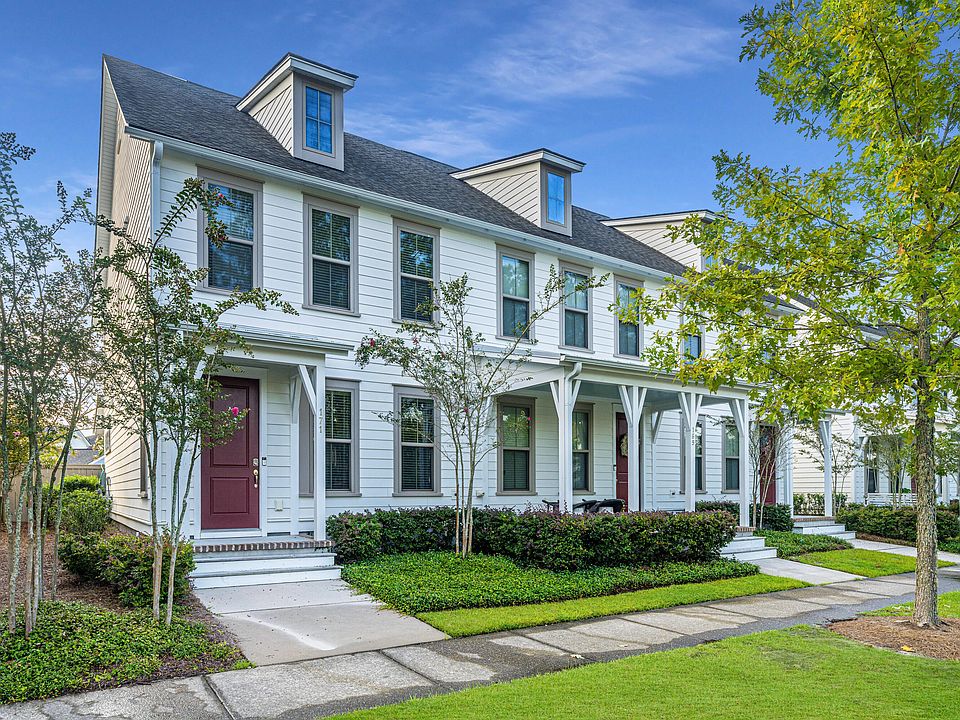 Beautiful move in ready townhome in Summerville's highly desirable Nexton Community. Full front porch. Open floor plan with added natural light as this end unit offers additional windows. LVP throughout first floor. Stunning kitchen with white cabinets, quartz countertops, stainless appliances including gas range and walk in pantry. Two bedrooms upstairs both with ensuite. Primary offers tiled walk in shower, dual vanities and separate water closet. Screened in porch was upgraded to four season room, fully fenced in yard with pavers, 2 rear parking spaces and additional street parking. Conveniently located close to dining, shopping, schools and I-26. Brighton park is Nextons premier neighborhood with 2 dog parks, pool, clubhouse, play park and walking / jogging trails.