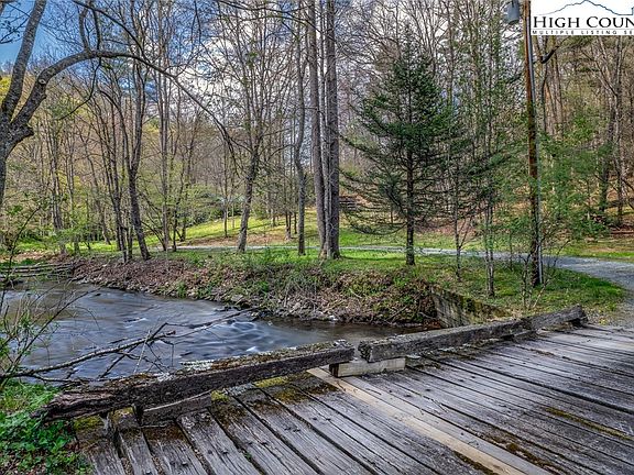 Rare opportunity for the avid fly fisherman and lover of the great outdoors to own a custom-built log home on 3.79 acres with 575-plus feet of Howards Creek frontage, only minutes from Boone, ASU, and other amenities. Cross the rushing creek and follow the driveway to your new home nestled in the woods. Custom-built by a father-son team with hand-hewn hemlock logs shipped from Canada and handsome interior walls of local wormy chestnut, cherry, and knotty alder. The main floor has a comfortable living room with a rock fireplace and gas logs, a half bath, a laundry room with its own entrance out to the back covered porch and patio, a spacious gathering room with a kitchen and ample dining space, and a primary en-suite bedroom with a full bath and exterior door to outdoor fireplace and patio. The second floor has two large bedrooms and a shared full bath plus a cozy office/playroom. A sweeping front porch offers a view of the rushing creek and a quiet space for relaxing. The lower level has garage parking, a workshop area, and lots of storage space. The seller receives mail at the downtown Boone Post Office. No physical mail delivery is available at this time.
