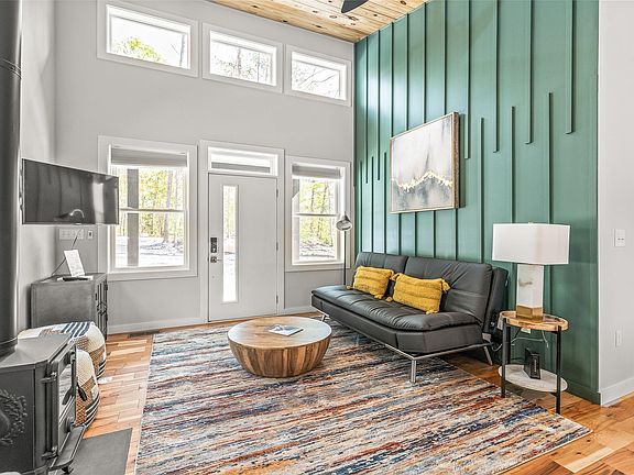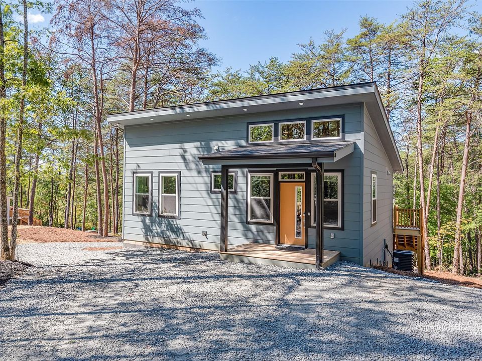 Luxury modern cabin near lake Lure and Chimney Rock! Craftsman built with attention to detail! A cozy 768 sq ft cabin has two bedrooms and one bathroom with gorgeous emerald green tile shower and granite countertops! Full kitchen with beautiful backsplash, custom kitchen cabinets, LG stainless steel appliances, hardwood floors throughout. Open concept living room flows neatly with the kitchen. A real wood burning fire stove adds wonderful display and coziness. Laundry closet with washer and dryer included! Going outside is a large back deck where you can unwind on a rocking chairs with beautiful view of the forest or enjoy the hot jacuzzi! Also a fire pit area adds to all the wonderful things to enjoy! Nestled on a little over an acre lot with no HOA! Cabin comes completely furnished, move in ready!