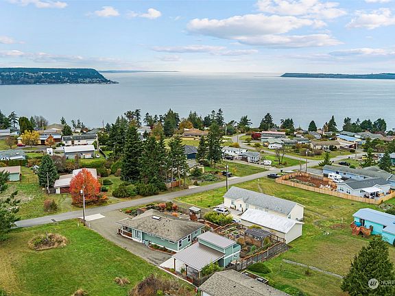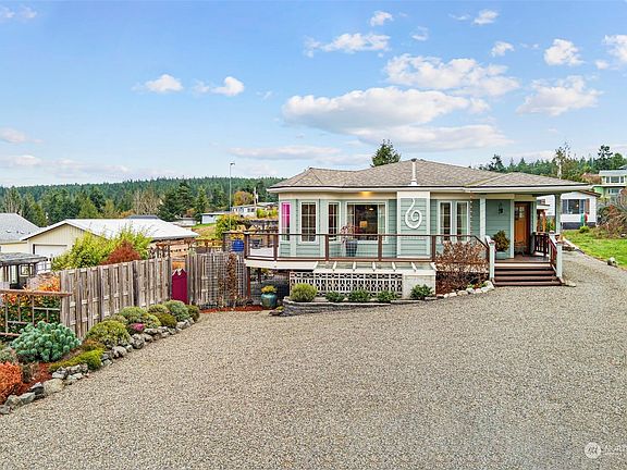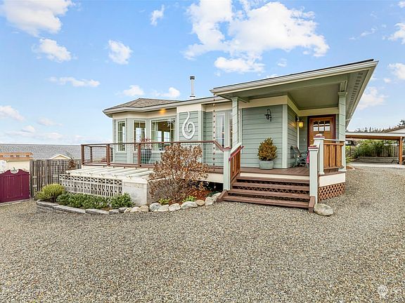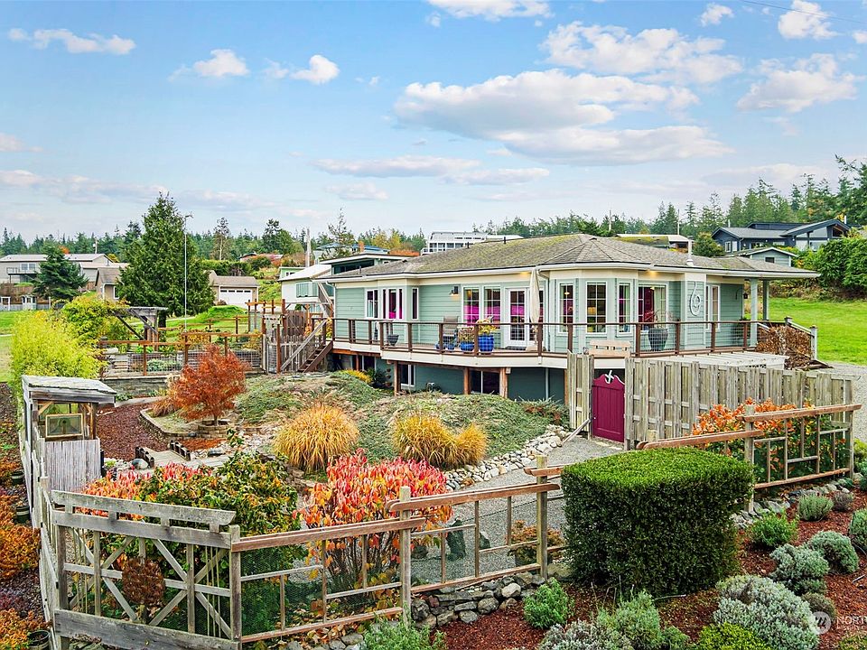 Perched on the hillside lies this 2014 custom built home w/ VIEWS of Strait of Juan de Fuca, Protection Island & Olympic Mtns. Main floor living provides the primary bedroom suite w/ walk-in closet, an office w/ a view, pellet stove, french doors leading to the deck overlooking the lovingly maintained gardens. The lower level has its own private entrance and is perfect for hosting guests or could be used as a short term rental; you will find 1 bdrm, bonus rm, an office, sitting area, 3/4 bathroom & an oversized wet bar. Don't miss the carport w/ shop space & a look out from above. Attention to detail abounds at this unique property. Community amenities include; private beach, pool, fitness room, clubhouse, and more! Come see this gem today!