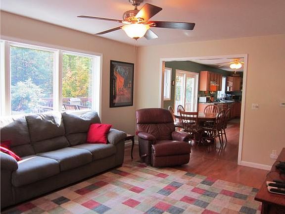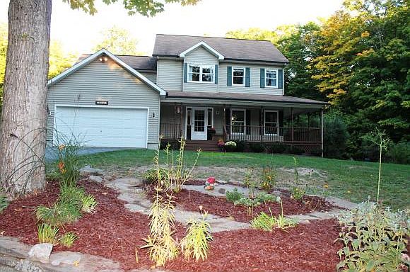 7 acres with woods and trails surround this well maintained 4 bedroom, 2 ½ bath home. Features large kitchen with oak cabinets, newer appliances and sliding doors to back deck and private yard. Open and flexible floor plan includes family room with pellet stove and dining room or formal living room. Master suite includes walk in closet and large bathroom. Full basement ready to be finished and attached 2 car garage. Watch the birds and wildlife from the wrap around porch or back deck. Many updates including flooring, paint and appliances. Convenient location to both Ithaca and Cortland.
