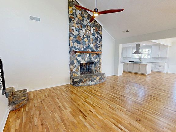 Large stonework fireplaceStonework entrywayWalk-in closetVaulted ceilingMaster has built-ins