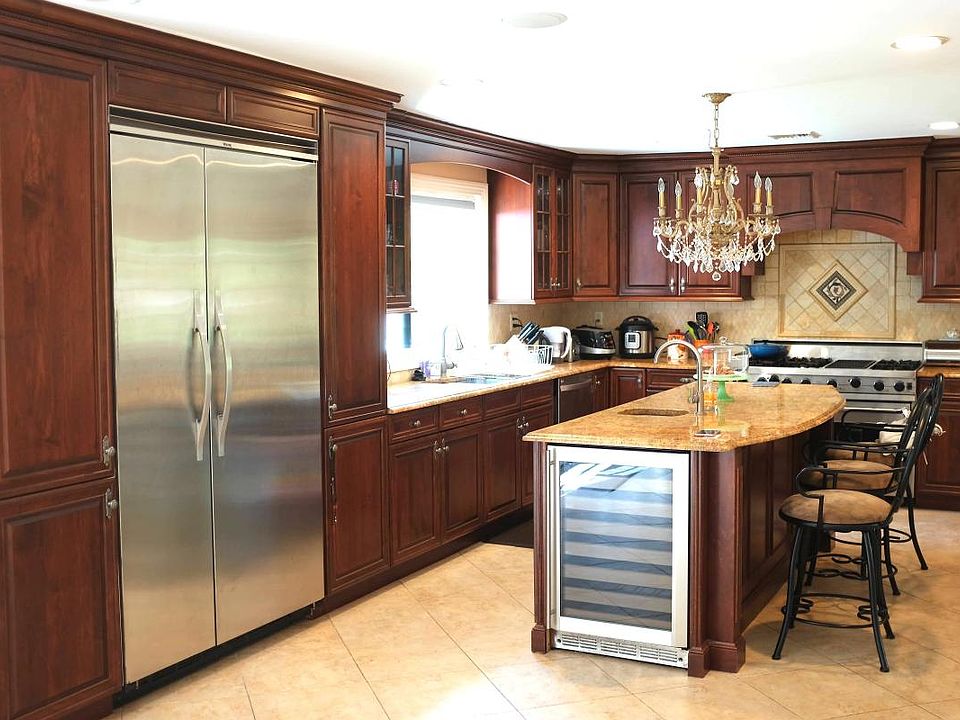 Updated custom built home. Large gourmet kitchen features granite counters, quality appliances, wine cooler, eat-in area and radiant heated floors. Main level offers radiant heated entry foyer, family room with fireplace, office, large paved deck, half bath, dining room, and formal living room. Master suite includes whirlpool tub, large neo angle shower and radiant floors. Ground level boasts movie theater room, kitchenette, slate half bath, additional family room and 2 car garage. Sizable landscaped yards. All sides brick exterior. Minutes to NYC.