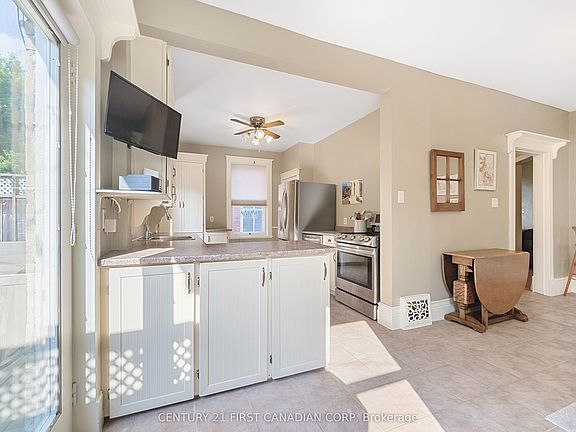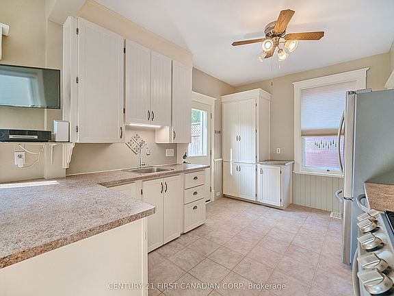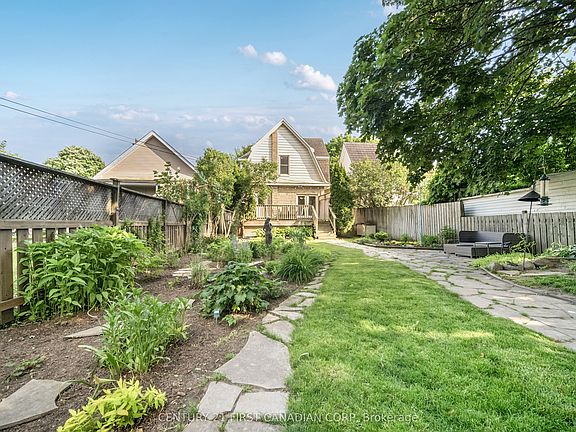 This incredibly well-kept yellow brick century home sits on a deep lot on a quiet, tree-lined street. Craftsman-style window casings, hardwood banisters, plaster ceiling details, and crown molding highlight the type of character you can't build today. Enjoy year-round comfort with the newer gas forced-air furnace and central air conditioning. Inside, front living room with fireplace, open kitchen and dining area, and three spacious bedrooms make the home both functional and inviting. The full basement adds generous storage space and has great future potential. The outdoor space space is a true highlight. Enjoy coffee on the classic covered porch or unwind on the elevated deck overlooking the deep, fully fenced and landscaped yard. Flagstone walkways, mature gardens, and a garden shed create a backyard perfect for entertaining, gardening, or relaxing. A private double-wide rear driveway offers parking multiple vehicles or space for a trailer/boat. Steps from West Lions Park, Kinsmen Arena, Thames River trails, Labatt Park, and downtown London, this is your opportunity to own a home that combines timeless character and charm, great curb appeal, all on a an exceptional lot.