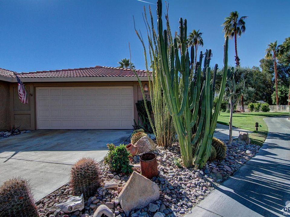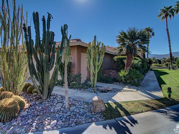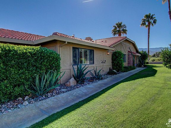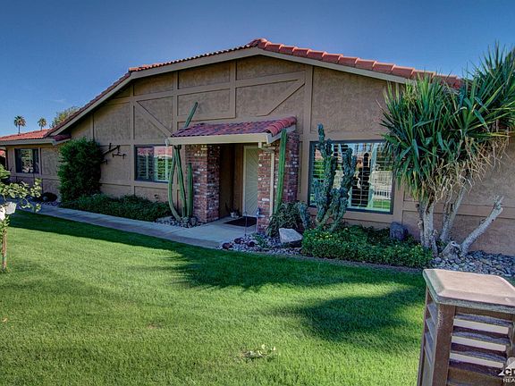 Motivated Seller. Bring ALL Offers!There is a peaceful feeling as you walk up to this 3Bedroom/3 Bath home, passing by the beautiful mature desert landscaping while gazing at the panoramic view of Santa Rosa Mountains. The home features newer kitchen cabinets with tile, wood-like flooring w/padding. The atrium has it's own sprinkler system. Master bedroom features a walk in closet while the bathroom has a tiled walk in shower w/glass block wall and storage cabinets. The guest on suite bathroom includes a jacuzzi-like bathtub. The private, covered backyard has been extended three feet so you can enjoy the south facing mountain views while sitting on your back patio. Five solar tubes throughout home provides extra light into the home plus, a new AC unit was installed in 2015. Pool located adjacent to the public pool.