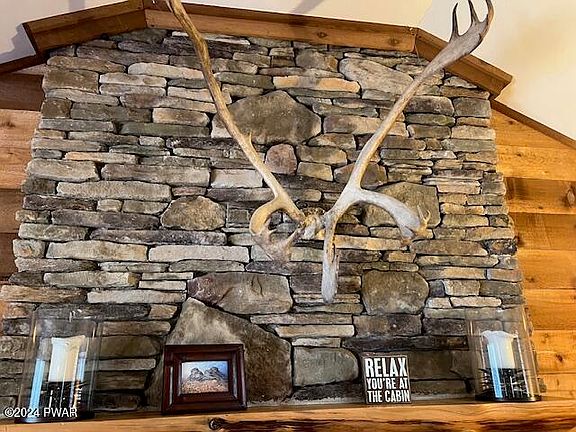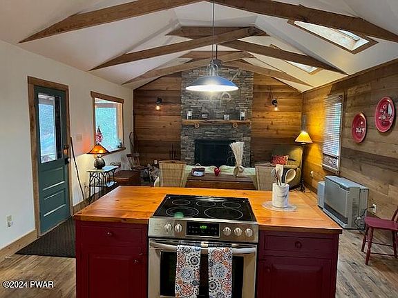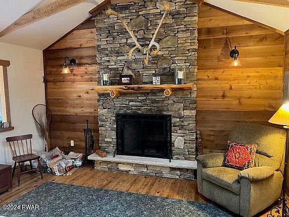 PROMISED LAND TECHNICAL LAKEFRONT - Enjoy sitting on a COVERED FRONT PORCH or in the SCREENED PORCH with views of the lake. Cathedral ceiling, rustic stone FIREPLACE, wood floors, cedar walls, skylights, and Amish custom made kitchen cabinets add rustic charm. 2 bedrooms, indoor bath with shower, back deck overlooks forest. Interior shower/washroom with room for toilet. Current toilet (see picture) in immediately accessible secondary structure. must be a PA resident to purchase - cash transaction., Key upgrades during current ownership: Installation of whisper-quiet, digital RINNAI heating system sized to cabin; Complete exterior painting of cabin and secondary building (2024); New rear deck; Installation of new screen throughout front screened porch (2024).
