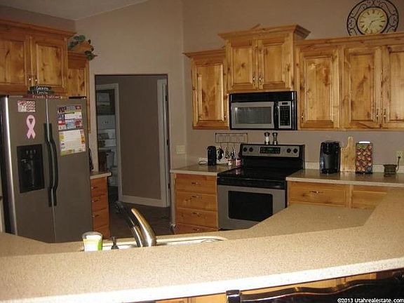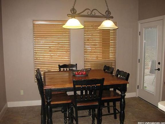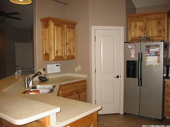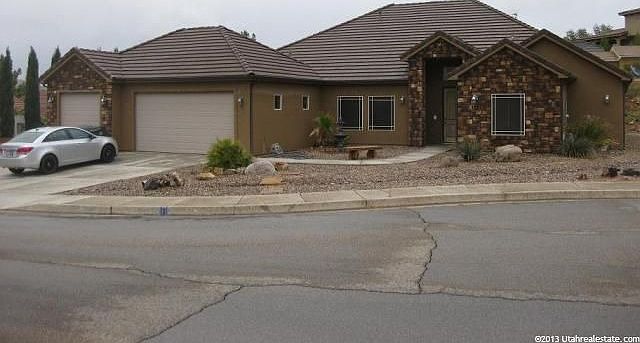Large Rambler on a quiet street in Hurricane. This home was built in 2005. Has 2x6 construction, tile roof, stucco with stone exterior. Vinyl windows. Nu-Tone intercom system with am/fm radio in all bedrooms, kitchen and back patio. Central vac. Water softener. Gas and electric hook-ups for both the dryer and stove. Yard is currently 95% fenced in and has custom ornamental iron fence with gates up front. Desert landscaping in front, lots of diamond retaining block in back. Fire pit area off large covered back patio. Gas hook up for grill. RV parking with full hook-ups on side including 50 amp breaker, water, and sewer dump. Room in back for second garage or pool. Large 3 car garage with lots of shelves included, approximately 800 sq. ft. 2 garage door openers, with key pad for single garage door. Beautiful 18” tile, upgraded nylon carpet, two tone paint, large baseboards, and Santa Fe doors. Raised bar in kitchen with corian counter-tops, stainless steel appliances. Pendant and can lights, walk in pantry with lots of storage. Open concept kitchen, dining and family room. Family room has vaulted ceiling with two ceiling fans. Formal with 12' entry, can lights, built in wood shelving and ceiling fan. Master is separate from other bedrooms. Has tray ceiling with can lights and ceiling fan. French doors open out to back patio. Walk in shower, jetted tub and large walk in closet. The other four bedrooms are located on other side of home. All have walk in closets and ceiling fans.