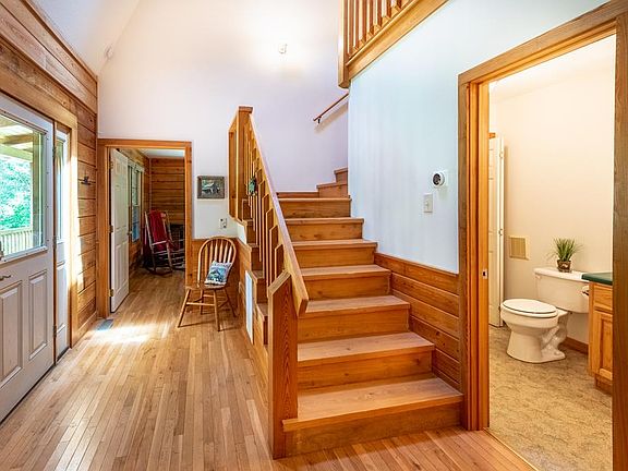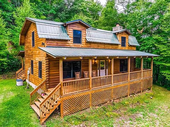 Tucked back with all the privacy a person would ever need, this amazing log home is the epitome of the peaceful, mountain cabin everyone is looking for. This 3 bedroom, 3 bath home is located in Rainbow Mountain, a gated community and sits on 5 acres of wooded land. The fall foliage and winter views are amazing from the rocking chair front porch. As you walk in there is a lovely entry and you step into the living room/dining area, the living room boasts a gorgeous, wood burning stone fireplace and wonderful hardwood floors throughout. The large primary bedroom is on the main level and has a walk in closet and en suite bath. Upstairs there is an open area for additional sleeping, conversation area or office and 2 more large bedrooms and a bath. This home has done well in the vacation home market and is so worth taking a look. Close to hiking, less than 30 minutes to Lake Chatuge and 15 minutes to Franklin