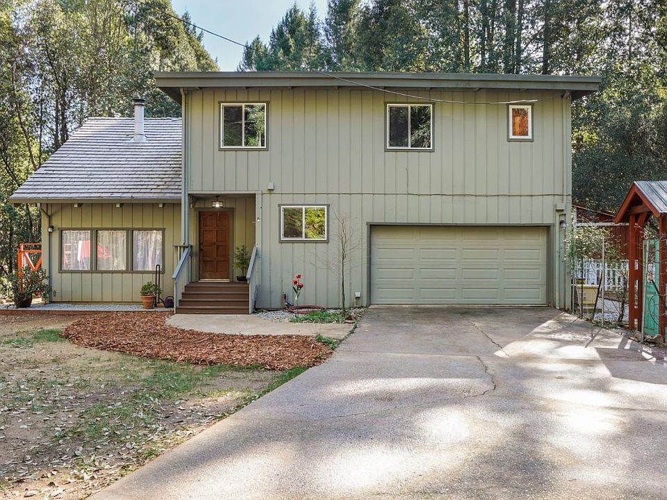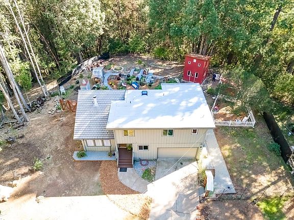 Peaceful & Private 3 acres in Bonny Doon with a lovely 3 bedroom home + office! This home in the Santa Cruz mountains features vaulted ceilings, 2 fireplaces, hardwood floors, skylights, primary bedroom suite with balcony. The kitchen has been updated with contemporary colors, gas stove, garden window & dining bar. Downstairs you have the main living areas, office and 1/2 bath, with the bedrooms upstairs. The property is a gardener's delight with so much room for all of your plants. A stylish building houses the water tank and another offers space for an art studio or office. So many delightful places to sit and enjoy the outdoors on this property. You have room for all of your recreational vehicles and toys with an attached 2 car garage and large driveway. Welcome Home!