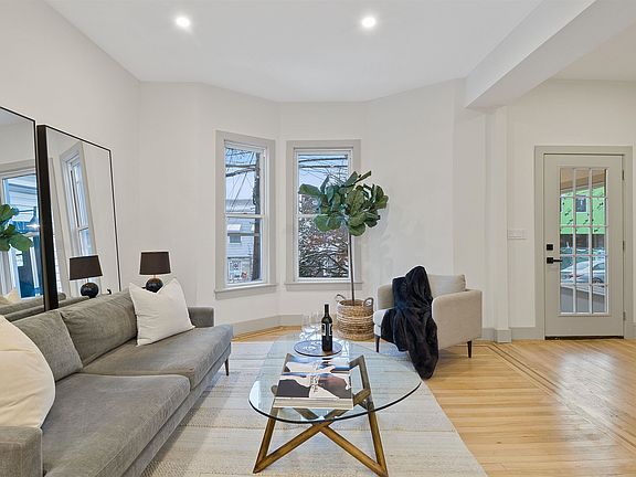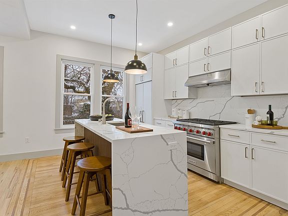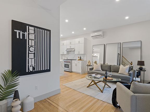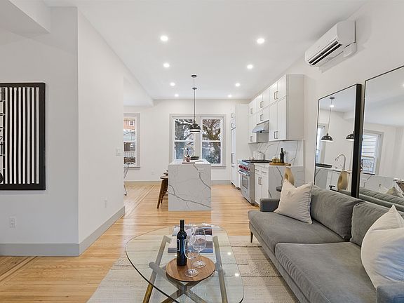 Welcome to 171 Thorne Street, a fully renovated 3-bedroom, 3.5 bathroom single family home in desirable Jersey City Heights. This fully detached home is sun filled and airy, with a lovely backyard garden with mature privacy trees. The open concept main level features a large custom kitchen features linen thin frame shaker cabinets, center island, quartz waterfall counters, Wolf gas range, and Fisher & Paykel paneled built-in refrigerator, freezer, and dishwasher. Built-in pantry cabinets and coffee bar flank the formal dining room. The second-floor features two spa-like full bathrooms, two generous sized bedrooms, one being ensuite. The finished garden level features two private entrances, a second ensuite bedroom and full bathroom, laundry area and ample storage. Mini-split high efficiency heating and cooling throughout. One block to NYC bus!