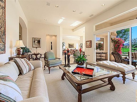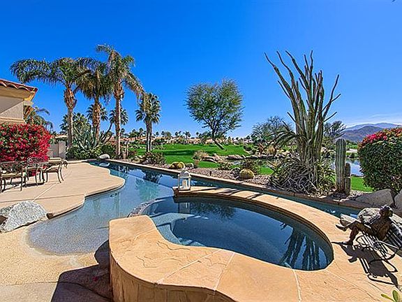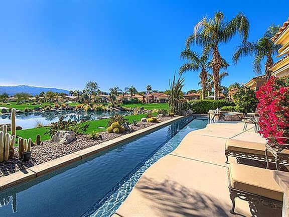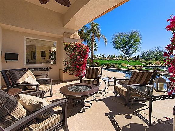 Views that go on forever! The absolute best view at Indian Ridge Country Club. You won't find a better value with this quality. This gorgeous home looks direct south to the Santa Rosa mountains overlooking the 5th and 6th holes of the Arroyo course. Nestled in a private location with spectacular views but with complete privacy. The private patio has a handsome beach front entry lap pool, waterfall spa plus BBQ area creating your own private oasis. The graceful foyer highlights soaring ceilings & opens to the formal dining room & living room with a travertine fireplace, wet bar & doors leading to the fabulous views. In addition, enjoy living & entertaining in the generous family room which flows easily to the gourmet kitchen with granite center island, walk-in pantry with load of counter space & updated cabinets. Travertine flooring throughout.