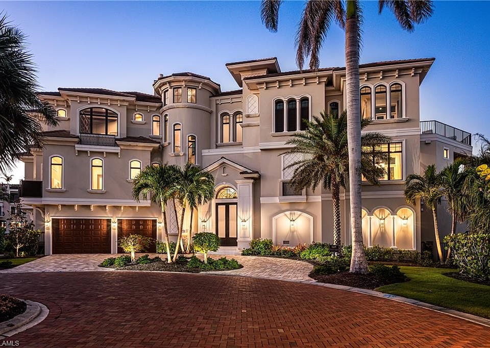 This 2019-Potter Homes built masterpiece is one of the most exceptional homes ever seen in Barefoot Beach. Positioned on one of the most coveted Bayside lots on a private peninsula in the exclusive, double-gated Southport on the Bay, this estate offers an unrivaled approximate 537* feet of wraparound water frontage, providing breathtaking Bay views on three sides and direct Gulf access. A more impressive panoramic waterfront view cannot be found. Crafted by the award-winning Potter Homes, this contemporary masterpiece is built like a fortress with all-concrete construction, hurricane impact windows and doors, and electric hurricane shutters. It is truly the ultimate retreat for beach lovers and boating enthusiasts, offering deeded beach access just a 10-minute walk away and direct Gulf access with no bridges from your 20,000 lb boat lift, along with a double jet ski platform lift. Every detail has been meticulously crafted, from the stunning oak flooring to the elegant coffered ceilings. The expansive floor plan spans 6,269 sq. ft. under air, featuring 6 bedrooms, a den, 6 full baths, 2 half baths, dual laundry rooms, a private elevator, a top-floor sundeck, a 3-car garage, and a versatile lower-level flex space. Step outside and experience one of the most extraordinary resort-style outdoor areas in the Barefoot Beach area. The outdoor space includes a large infinity-edge lap pool with a tanning shelf, water features, a swim-up bar, and a waterslide, all complemented by fire bowls and a fire pit—creating the ultimate space for entertaining. The outdoor patio features electric screens, a cozy fireplace, and a summer kitchen—perfect for al fresco dining and enjoying the serene surroundings. Inside, the chef’s kitchen boasts crisp white cabinetry, quartz countertops, high-end appliances, and multiple dining areas. The primary suite offers an unmatched retreat, complete with an attached office/den, wet bar, fireplace, and a private sundeck overlooking the bay. The spa-like bathroom features dual vanities, a large shower with a rainfall showerhead, and a separate soaking tub. Ascend the spiral staircase to the top-floor observation deck, where you can savor stunning sunsets and panoramic water views. Conveniently located near fine dining, RSW Airport, Mercato, and Waterside Shops, and just 15 miles from the renowned Fifth Avenue in Naples, this home is a true gem in the heart of Southport on the Bay.