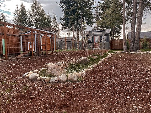 Wanting a newer home but don't want to wait on New Construction time frames or water memberships? Check out this beautifully built Custom single level home in very desirable North Idaho area; Moyie Springs. Surrounded by beautiful rivers & mountains, yet near all conveniences with town only minutes away. Quality built by reputable Volking Construction, this 3 bedrooms, 2 baths home features a family room with Vaulted Ceilings, Granite Countertops throughout home, Stainless steel French Door Refrigerator, Extra large W/D capacity, Six panel doors, Quality slow close Cabinets, Food pantry in kitchen, Dishwasher, Oven/Range with overhead Microwave, Garbage Disposal, 80% High Eff. Gas Forced Air Heating System, and 200 amp Elec. panel. Exterior: 30 year architectural roof, 8'' LP Lap Siding, Vinyl windows. 5/12 roof pitch, 10 x 20' patio concrete slab, Landscaped front porch with side walks to 20X24' garage concrete parking slab. Fenced in yard features a lit up private fire pit area off the back of the home. Mature privacy trees, lilac bushes, and more! Matching 8x12 garden shed and chicken coop complete the freshly tilled fertile 757 SF garden ready to plant in. Wood blinds installed in all windows. 1188 SF. Must see to fully appreciate!