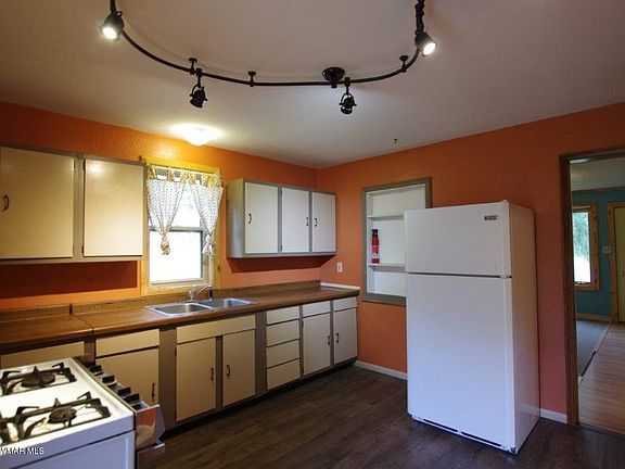 Adorable 2 BR, 1 bath home on nearly an acre in town! Home features newer windows, metal roof, fresh paint in and out, laundry up or down, natural gas heat and city services. Includes workshop/storage garage, shed, fenced garden area, chicken yard, fenced back yard, towering white pines, and apple trees. A little bit of country in town!