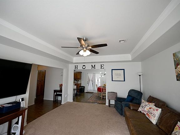 Stunning and well-maintained, this home is move-in ready! The floor plan boasts of a spacious living room, an open kitchen/dining concept, three nice-sized bedrooms and two full baths. The kitchen has stainless steel appliances, including a double oven. A handy serving/eating bar is included. Notable features include a massive amount of storage, tray ceilings, bull nose corners, and custom woodwork. The large utility room has a sink with a new faucet and the home has a nest thermostat. The roof was replaced in 2019, gutters include leaf guards, and the AC was replaced in 2020. The security system components and existing doorbell will not remain with the property. The sellers will replace the door bell with a “ring” doorbell. The covered back patio offers great shade and a great place for entertaining or just enjoying quiet time on the back patio (patio furniture and hanging lights remain on the patio). The fenced backyard also includes a 10x12 insulated storage building. The oversized garage includes the shelving units. There is not an HOA for this property.