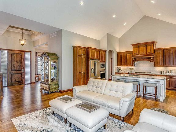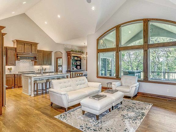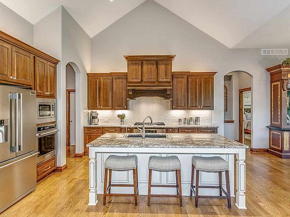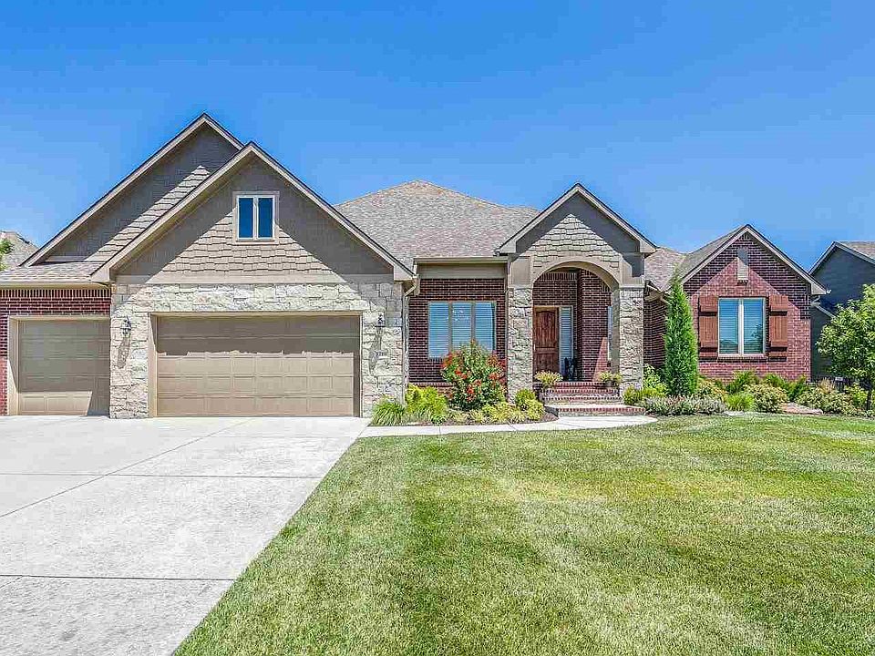 Priced below seller's basis! This home has the Wow factor! You must come and see this one! Seller custom finished this home with all the latest upgrades. It shows brand new. The main level features a stunning view of the private treed countryside east facing backyard as soon as you enter. The living room is vaulted with a stunning floor to ceiling stone fireplace flanked by large built in bookcases. The kitchen is gourmet with light granite, double ovens, gas cooktop, large walk in pantry and a picture perfect breakfast nook surrounded by windows flooding with light. The Master Bedroom is beautiful with trimmed ceiling, a walk out door to the deck, double vanities, tub and large tiled walk in shower. There are real hardwood floors throughout the main level including the Master Bedroom. The home also features Hunter Douglas Silhouette blinds throughout and additional custom window treatments . The 2nd and 3rd main level bedrooms each have their own private bathroom vanities. The lower level is a true walk out at grade with an abundance of windows so it does not feel like a basement. It has all of the extras including a theater with projector and screen, surround sound built in speakers, barn doors, a stone fireplace and bar with granite counter tops. It truly can be called a man cave. The basement has 3 additional bedrooms / music/exercise rooms with 2 additional full baths plus storage. The deck is over-sized and covered with vaulted ceiling and surround sound that is perfect for entertaining and enjoying summer evenings. The lower level patio is also covered with accent lights for entertaining and grilling. The backyard is truly sought after with complete privacy overlooking a treeline and countryside. The landscape is lush and stunning. This home is located in Sedgwick County in the Andover School District. Hurry homes of the caliber and price don't last long.